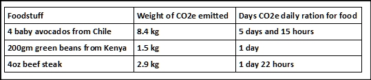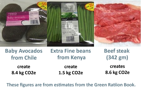 Although learned bodies such as the Royal Society have published information on the carbon footprint of food, consumers are only vaguely aware of its climate impacts. Even if the estimates in the Green Ration Book are rough and ready, it is clear that avoiding climate disaster will require large changes in food production and consumption. The common explanation of footprints using the concept of air miles is not the only consideration. Although the CO2e emitted by air freight for some foods easily break personal carbon budgets there are other sources of greenhouse gas emissions: The methane emitted by ruminant livestock (cows, sheep, goats &etc.) have a large impact and most of the food we eat has been fertilised by nitrogen compounds derived from the energy intensive Harber-Bosh process: