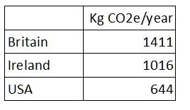 When these figures are converted to Carbon Dioxide Equivalent (CO2e) to take account of the extra greenhouse effects of air travel, yearly emissions become : Britain 1206 kg CO2e, Ireland 868 kg CO2e and US 550 kg CO2e. Adding 17% to account for increases in air travel sice 2017 gives the CO2e cause by the air travel of the average citizen as: