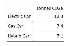 The UK Climate Change Act of 2008 aims to cut greenhouse gas emissions by 80% by 2050 to approximately 2.5 tonnes CO2e per year. At these estimates the emissions from the manufacture of an electric car are 5 years of this total budget. [Or 20 years of a travel budget if the total is divided equally into categories: food, housing, travel and an individual’s share of government emissions].