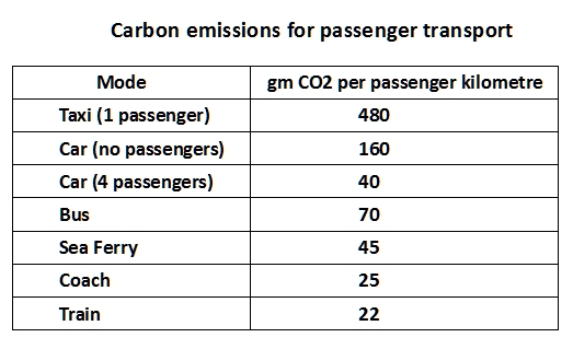 As discussed above, air travel and the mass use of private cars must be greatly reduced to be compatible with avoiding dangerous climate change. However, a comparison of car emissions with other forms of transport is informative. The following figures have been updated from The Green Ration Book for carbon emissions for passenger transport. They not include the emissions from manufacture.