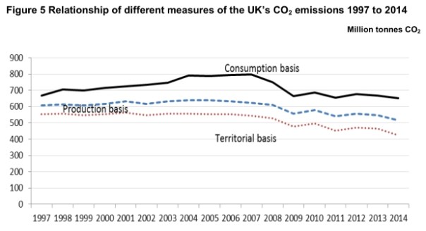 That’s bad enough, but compare the graph from BEIS with one from a DEFRA, UK’s Carbon Footprint 1997 – 2014. This shows UK carbon emissions calculated on a consumption basis. These are not falling like the ‘official’ figures which are measured on a production basis. Measurements on a production basis do not count the embodied carbon in imports so that when UK steel works are shut, their emissions are no longer counted and the UK Carbon emissions decrease. Estimates of carbon emissions measured on a consumption basis will count the emissions caused by the replacement steel imported from overseas.