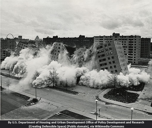The high-point of [ the trend against Architectural Determinism ] was the delight shared over the demolition of the famously dangerous and dysfunctional Pruitt-Igoe urban housing complex in St Louis in the US.
