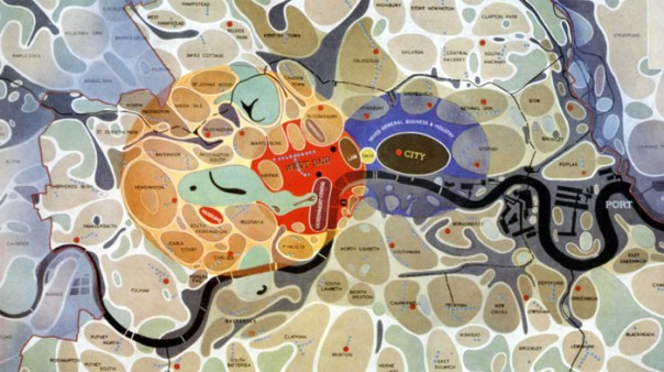 Greater London plan (1943), Abercrombie and Forshaw. The drawing shows the structure conceived by Abercrombie for London. It is made up of a large number of communities, each sharply separated from all adjacent communities. Abercrombie writes, “The proposal is to emphasise the identity of the existing communities, to increase their degree of segregation, and where necessary to reorganise them as separate and definite entities.” And again, “The communities themselves consist of a series of sub-units, generally with their own shops and schools, corresponding to neighbourhood units.” The city is conceived as a tree with two principal levels.
