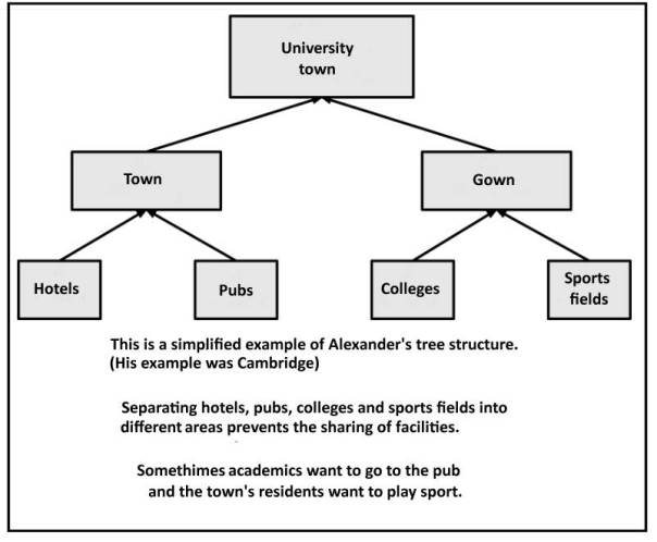 Christopher Alexander’s A city is not a tree was a revelation to read in the early 1970s. The planning approach of Corbusier and the modernists was that the commercial, residential, and industrial functions of a city should be separated from each other into separate districts.