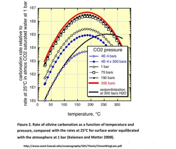 The mineral olivine is taken as the example for this note. It absorbs CO2 slowly at ambient temperature (25°C) but much faster at a temperature of 186°C.